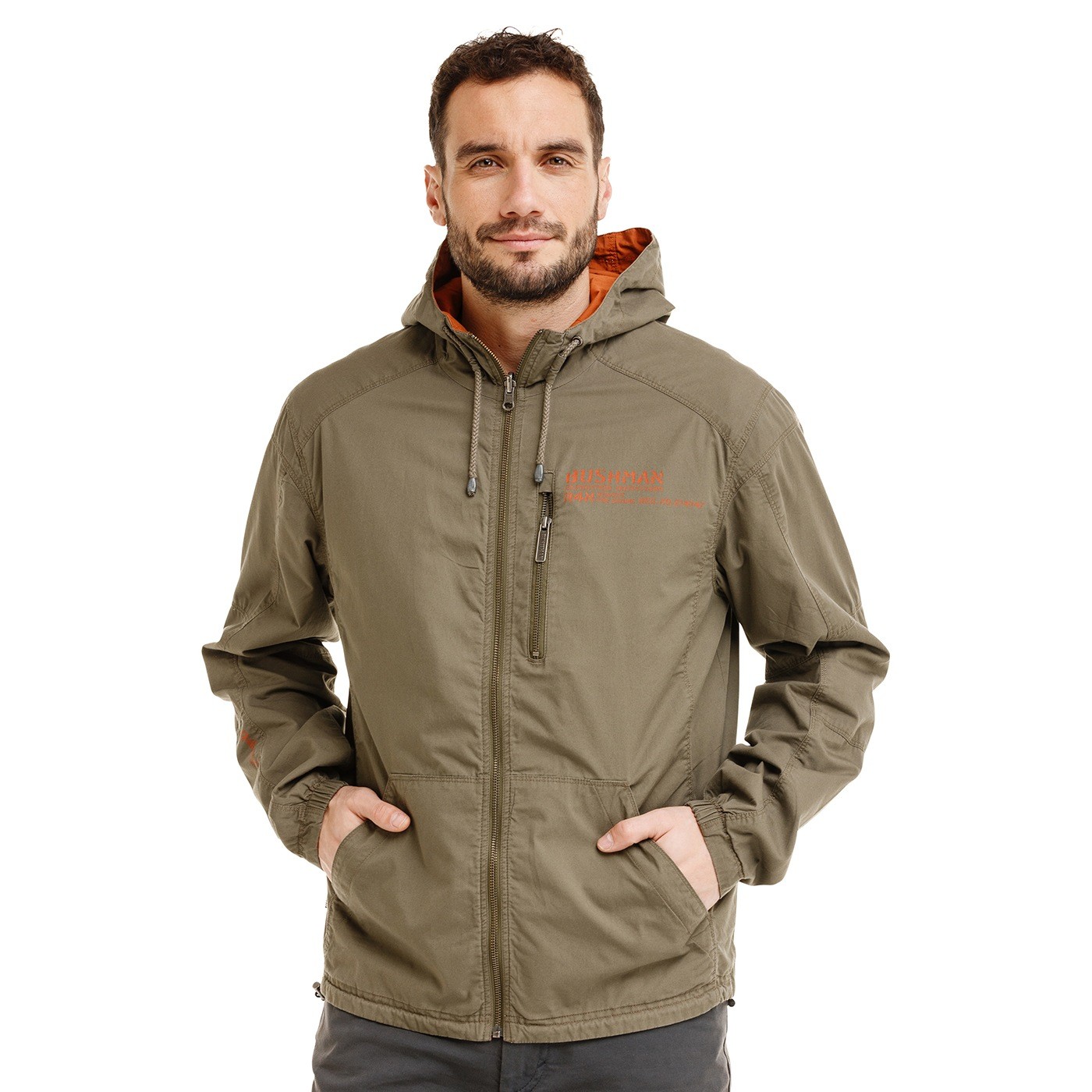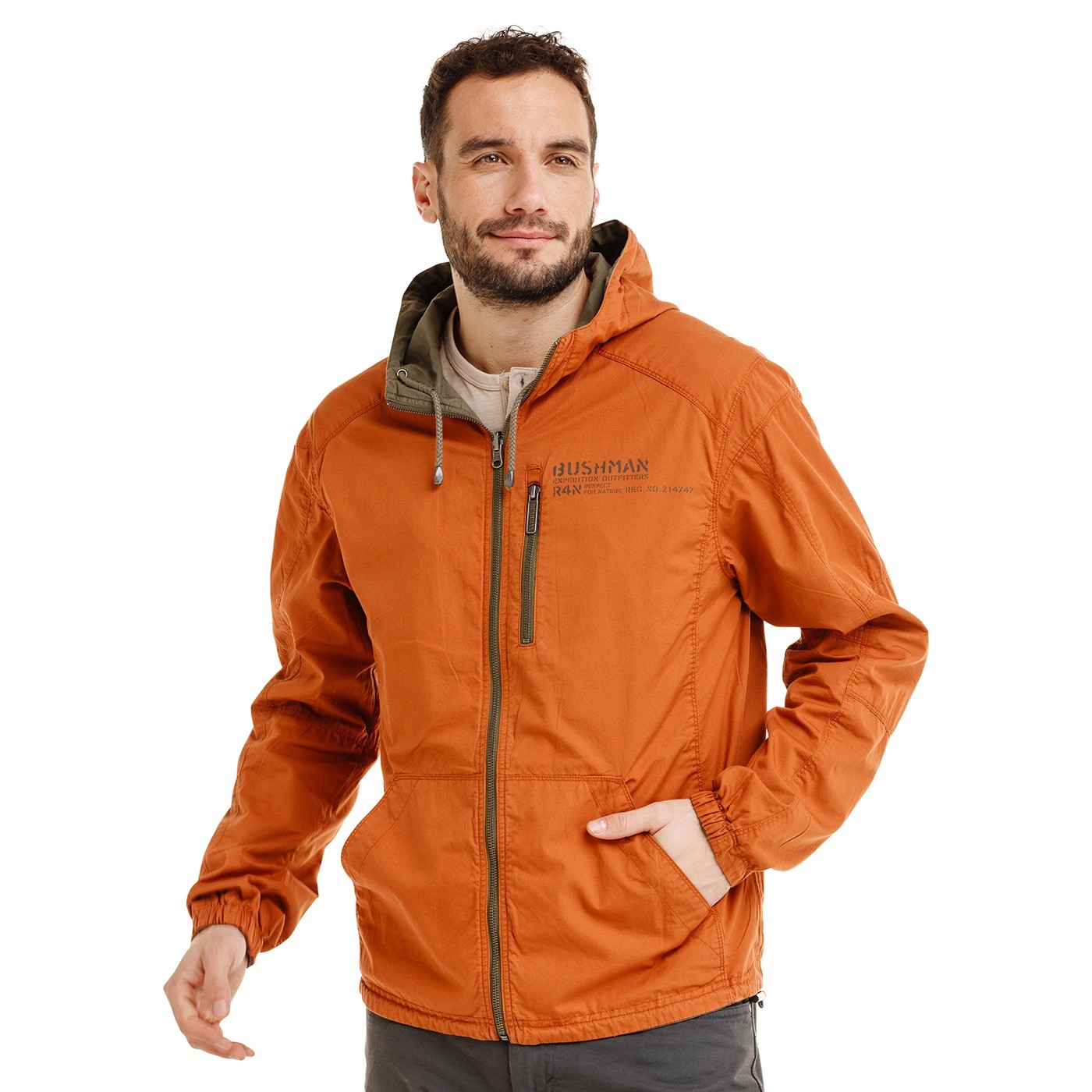Tahle celopropínací (kovový YKK zip) bunda je pro všechny chlapy, kteří chtějí variabilitu a praktičnost v jednom. Oboustranné provedení dává možnost měnit styl – tmavě zelená strana působí nenápadně a terénně, cihlová s leteckým potiskem je pak výraznější a podtrhuje bushmanský charakter. Kapuce se stahováním a ukončení spodního lemu i rukávů pomocí gumy zvyšují komfort nošení a chrání proti větru. Spodní a horní kapsy na zip spolu s vnitřní kapsou poskytují dostatek místa pro drobnosti.