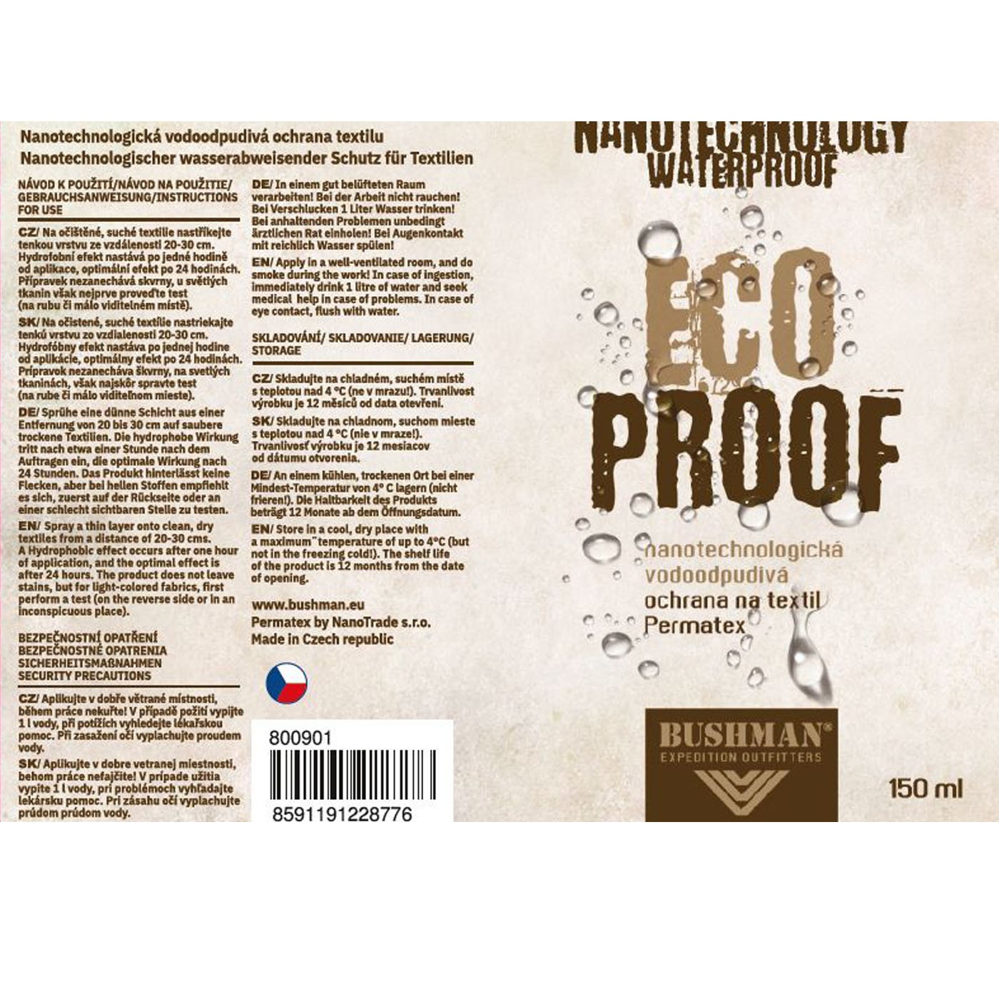 Impregnace BUSHMAN ECO PROOF je nanotechnologická vodoodpudivá ochrana na textil Permatex, díky níž se proti vodě ochráníš i v oblečení z přírodních materiálů. Nezanechává žádné skvrny ani nemění vzhled povrchu, přesto doporučujeme u světlých látek otestovat na menší ploše na rubu nebo na místě, které není přímo viditelné.