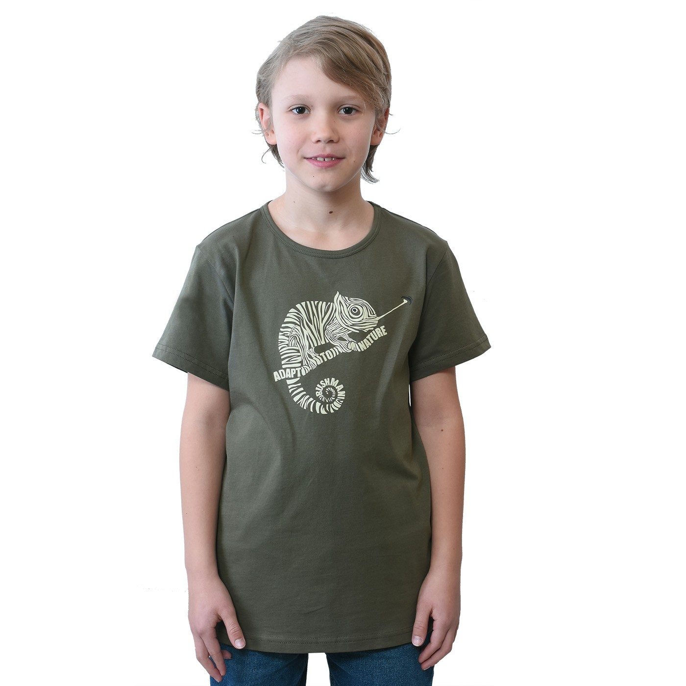Umí se přizpůsobit přírodě? S chameleonem na prsou i na zádech to zvládne hravě! Dětské bavlněné tričko s krátkým rukávem MONTY s originálním zvířecím potiskem pro skutečné dobrodruhy.