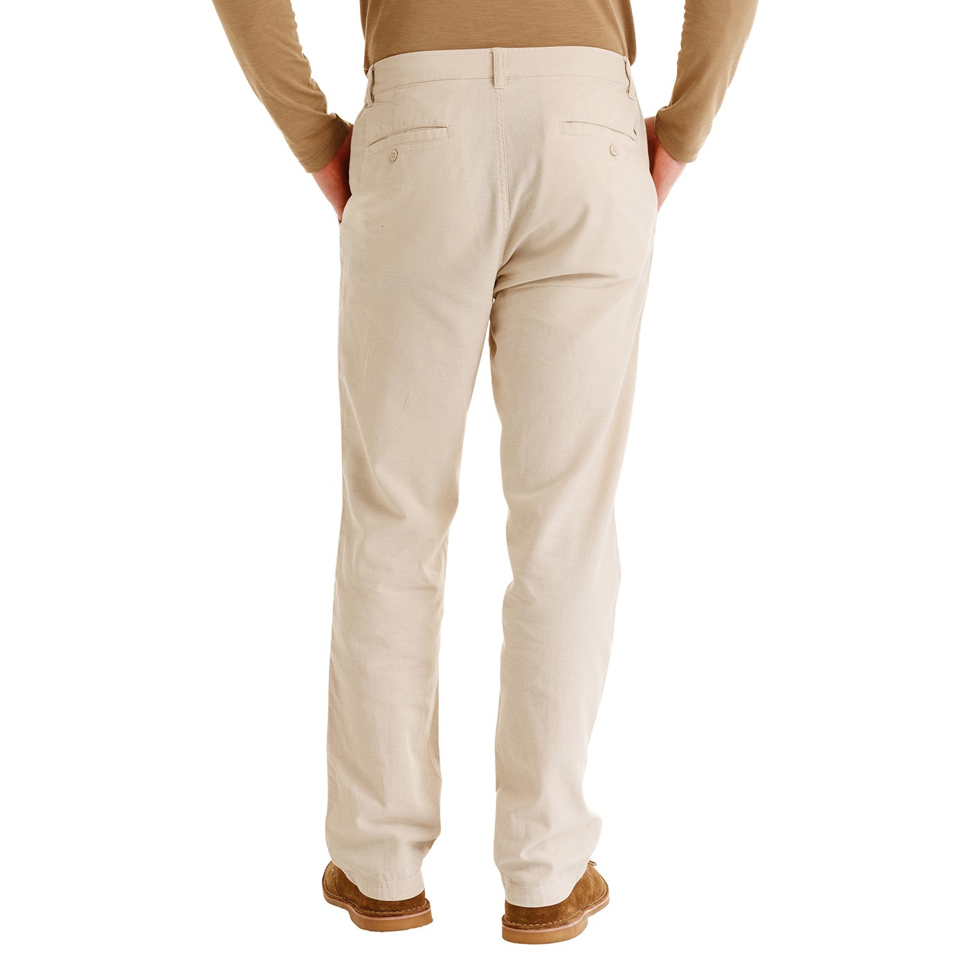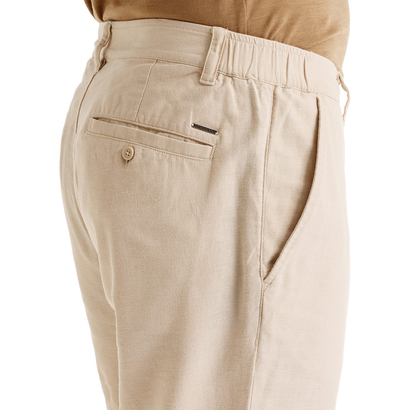 Klasické rovné kalhoty volnějšího střihu se stažením do gumy v pase a na bocích. Materiál (bavlna a len) je lehký, prodyšný a příjemný, zachovává si ale pevnost a tvar. Díky keprové vazbě (twill) je snížena mačkavost. Nechybí praktické kapsy s brandovými detaily a kovový YKK zip.