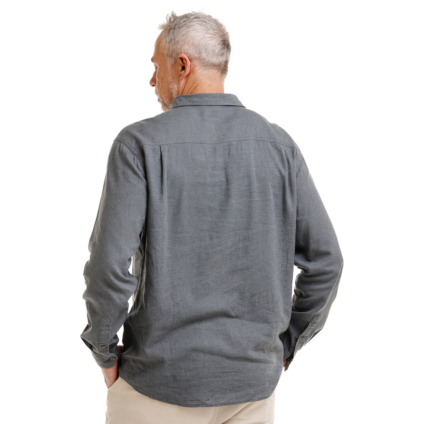 Košile VAAL staví na lehkosti materiálu a volnosti pohybu. Kombinace lnu a viskózy EcoVero® spojuje přirozenou prodyšnost lnu s měkkostí a splývavostí moderního, udržitelně vyráběného vlákna. Výsledkem je tkanina, která je příjemná na dotek, dobře dýchá a funguje i v teplejších podmínkách. Čistý design bez kapes nechává vyniknout střih a materiál, zatímco dva záhyby na zádech zajišťují pohodlí při pohybu. Tvarovaný spodní okraj umožňuje volné, ležérní nošení. Jemná výšivka na zadním sedle nenápadně potvrzuje bushmanský původ.