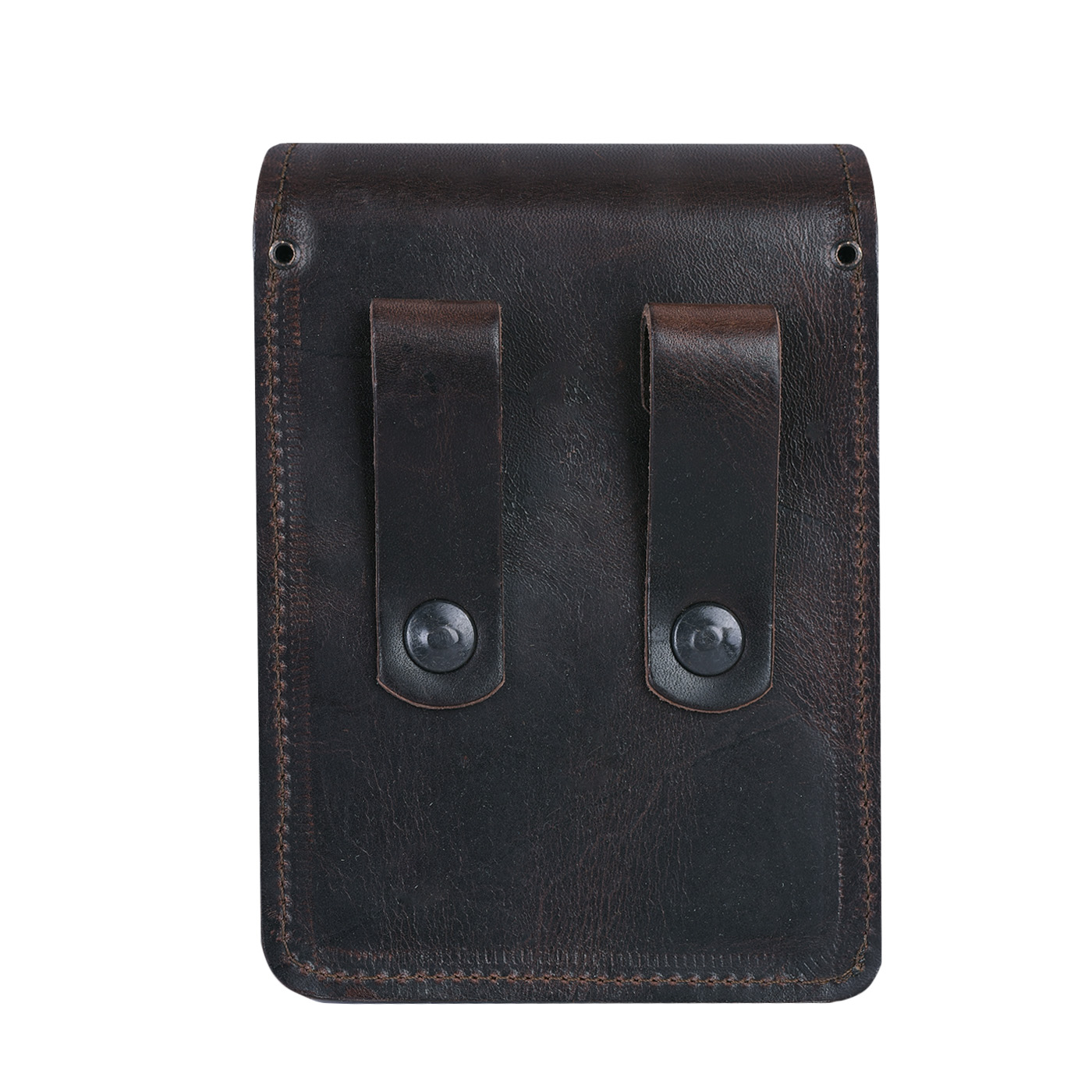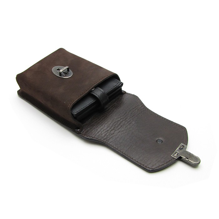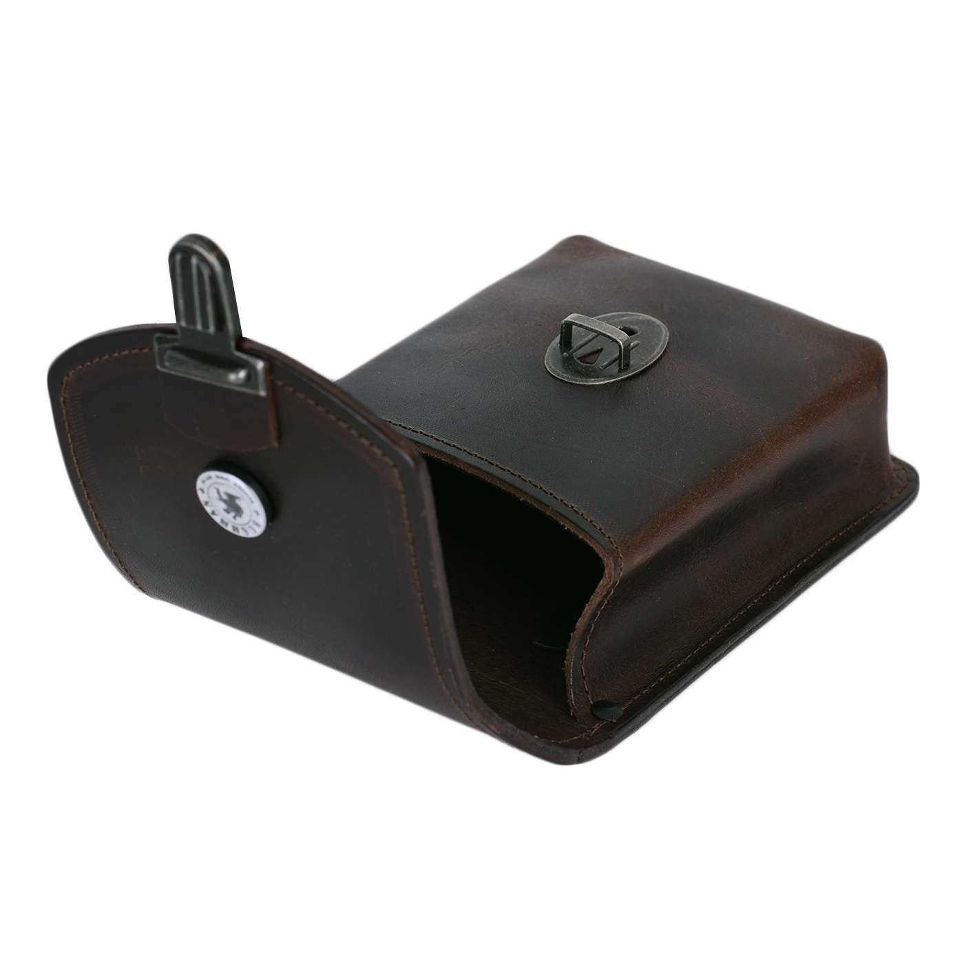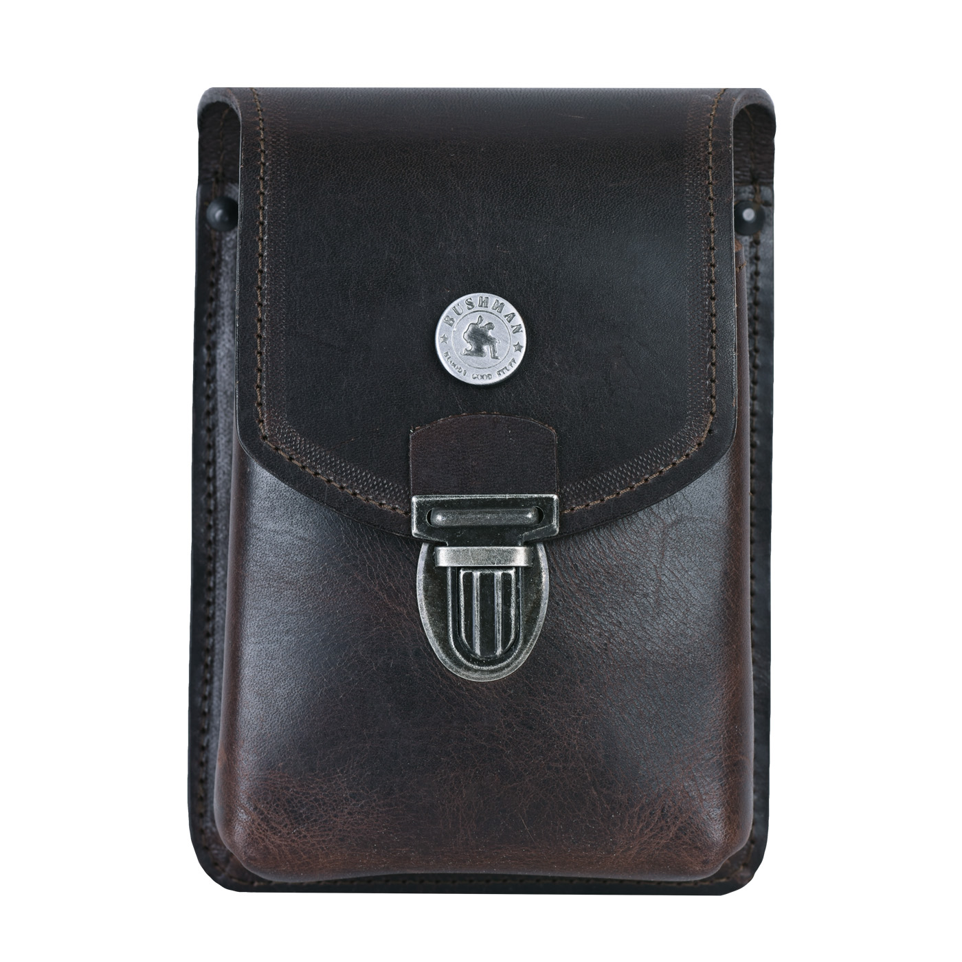 Materiál broušená hovězinová useň, Aktovkový zámek pro zavírání, Odlitek loga Bushman, Rozměr 145 x 100 x 45 mm, Uchycení k opasku