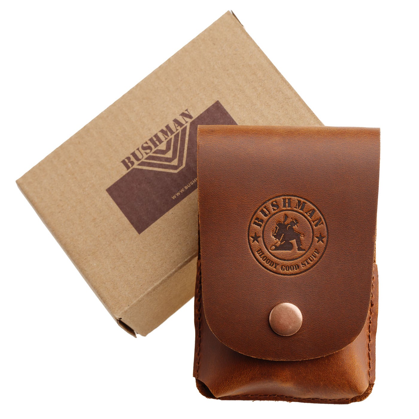 Všechny nástroje jsou uložené v tmavě hnědém koženém pouzdře s mosazným drukem a decentním vyembosovaným logem BUSHMAN.