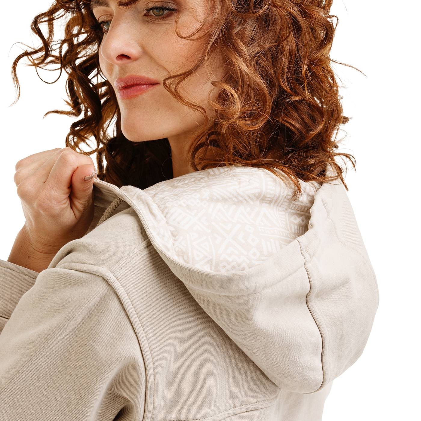 Variabilitu podtrhuje možnost stažení kapuce (pomocí pevné tkanice s kovovým brandovým zakončením), rukávů a také spodního lemu. Mikina je navíc přebarvena po ušití, díky tomu má sytý, jemně nepravidelný odstín, který působí rustikálně a autenticky. Vzorovaná bavlněná podšívka dodává jemný kontrast a charakter expedičního outfitu. Neschází ani praktické poutko.