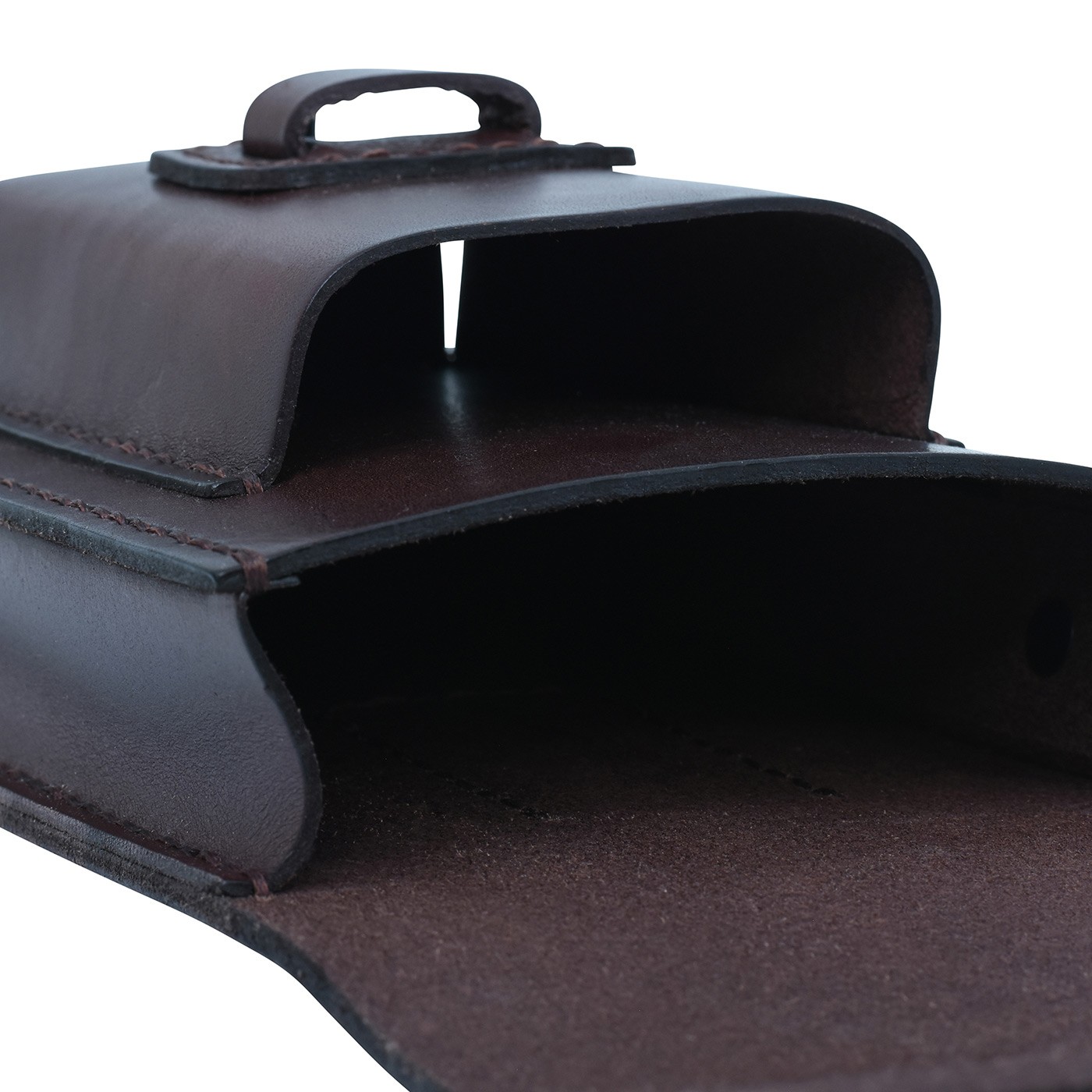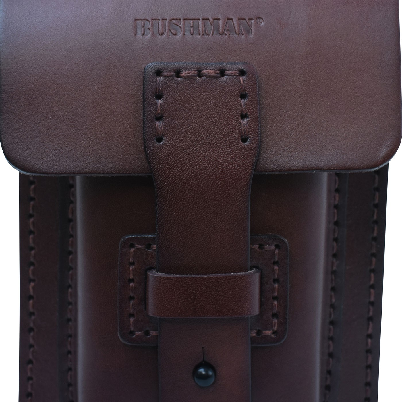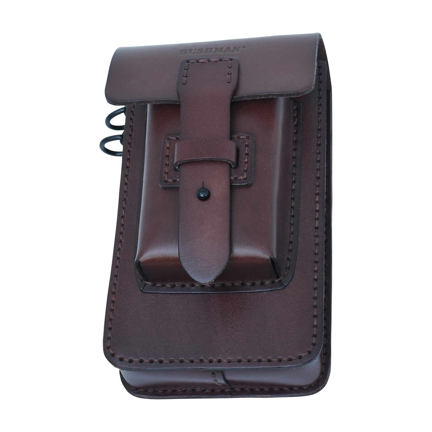 Kožené pouzdro TONGARIRO z hovězí kůže na telefon a drobnosti. Má dvě kapsy – hlavní větší a přední menší. Zapínání na kovový cvoček brání samovolnému otevření. Na zadní straně kovová spona pro uchycení k opasku, na chlopni v přední části vyražené logo BUSHMAN. Rozměry 11 × 19,5 × 8,5 cm.