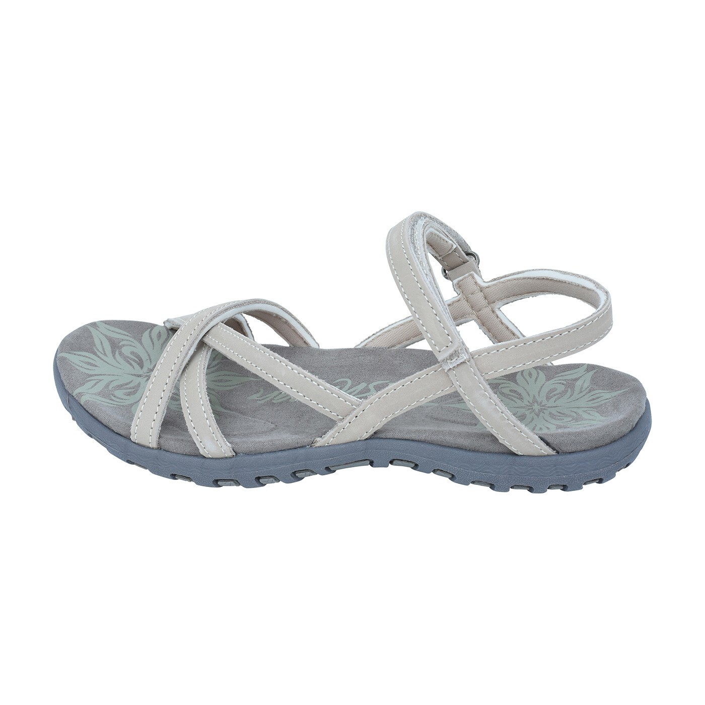 Sandály s anatomicky tvarovanou stélkou z mikrovlákna s antibakteriální úpravou. Kaučuková podešev tlumí došlap a vzor inspirovaný kapradím dodává lehký a stylový detail. Minimalistické kožené pásky zajistí, že sandály perfektně (a příjemně) sednou. Ideální k sukni, šatům i kraťasům.