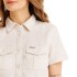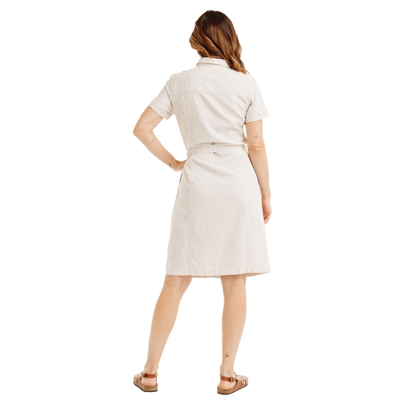 Celopropínací (nejen) expediční šaty ze směsi bavlny a lnu. Vyštíhlený střih zvýrazňuje siluetu (a podpoří ji také textilní pásek), zapínání na bambusové knoflíčky podtrhuje přírodní charakter modelu. Nechybí nakládané náprsní kapsy a kapsy v bočním švu v úrovni boků. Jemná brandová výšivka na zadním díle a brandový potisk na vnitřním sedle zadního dílu.