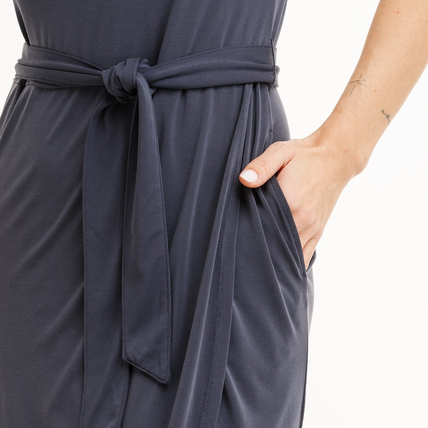 Dámské šaty z modalu s příměsí nylonu a elastanu s efektem „cupro touch“, který jim dodává luxusní hladkost. Elegantní lodičkový výstřih a spadlý rukáv zajišťují pohodlí. Zavinovací efekt na předním díle (širší látkový pásek lze provléct poutky v pase) jemně zdůrazní siluetu. Drobný semišový label na spodním lemu.