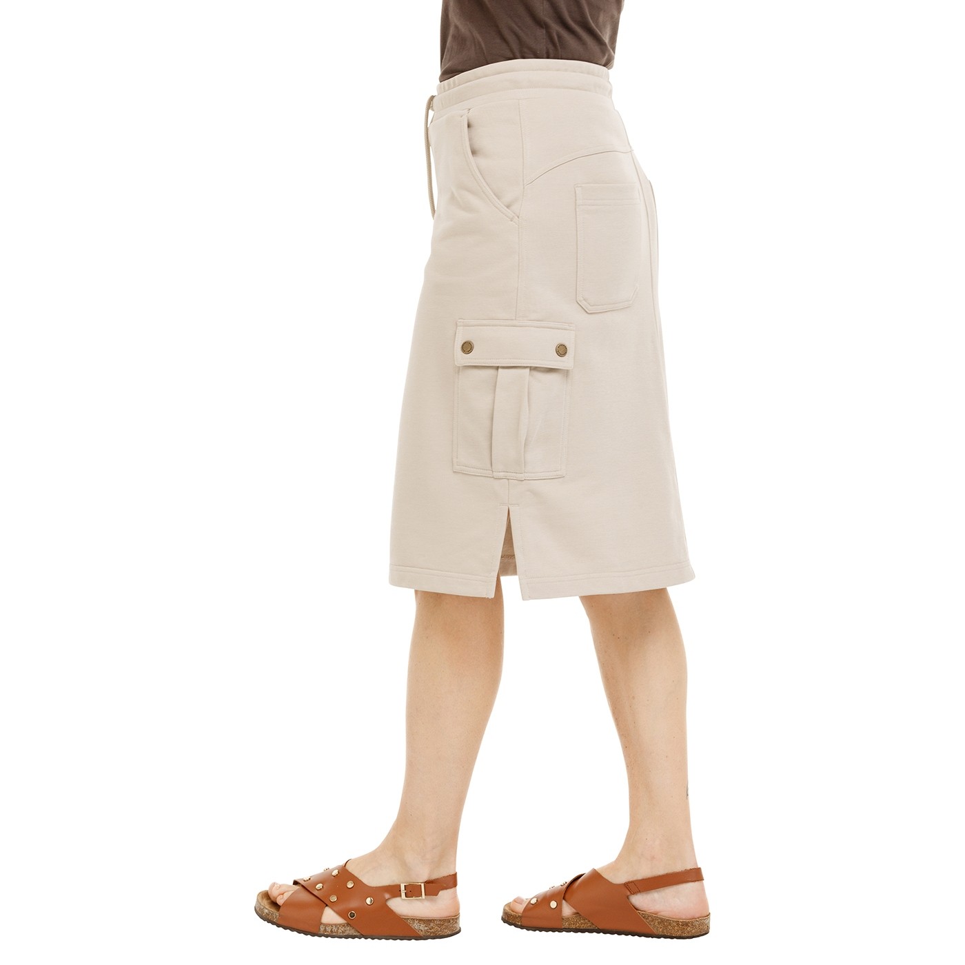Expediční dámská sukně kapsáčového typu z hřejivé bavlny s přídavkem polyesteru (zpracování french terry). Pas stažen do gumy (s tkanicemi s kovovým zakončením s brandingem). Nechybí řada praktických kapes. Tvarované zadní sedlo lehce vykresluje siluetu a dva boční rozparky usnadňují pohyb. Sukně sahá lehce pod kolena.