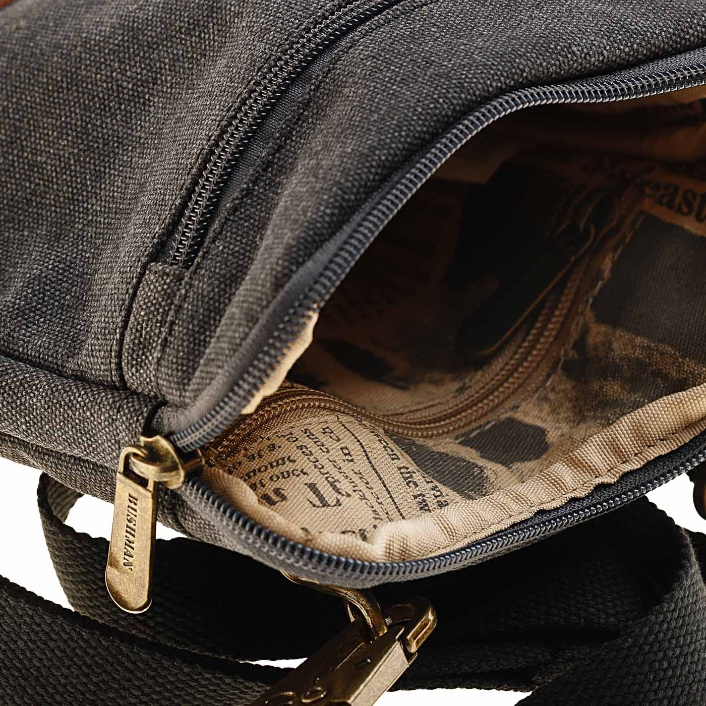 Malá praktická plátěná taška s odepínatelným popruhem přes rameno, s možností nošení kolem pasu. Dvě vnitřní a jedna vnější kapsička nabízí mnoho praktických úložných prostor, například na mobil či jiné drobnosti. Detaily z pravé kůže dodávají tašce šmrnc.