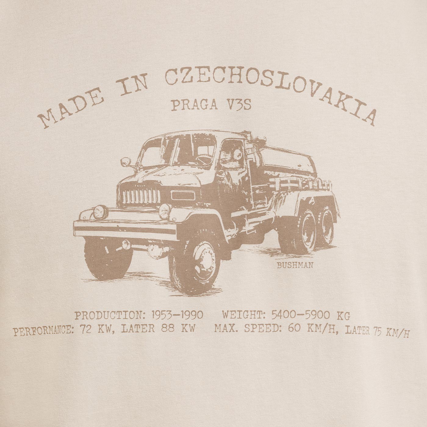 „BOBSTOCK“ potisk Made in Czechoslovakia doplňuje motiv legendárního vozu V3S, symbolu poctivého strojírenství a nezdolnosti. Tahle klasika se neobtěžuje vysvětlováním – kdo ví, ten ví. Potisk je poctou československé technice, která si vydobyla respekt doma i ve světě.