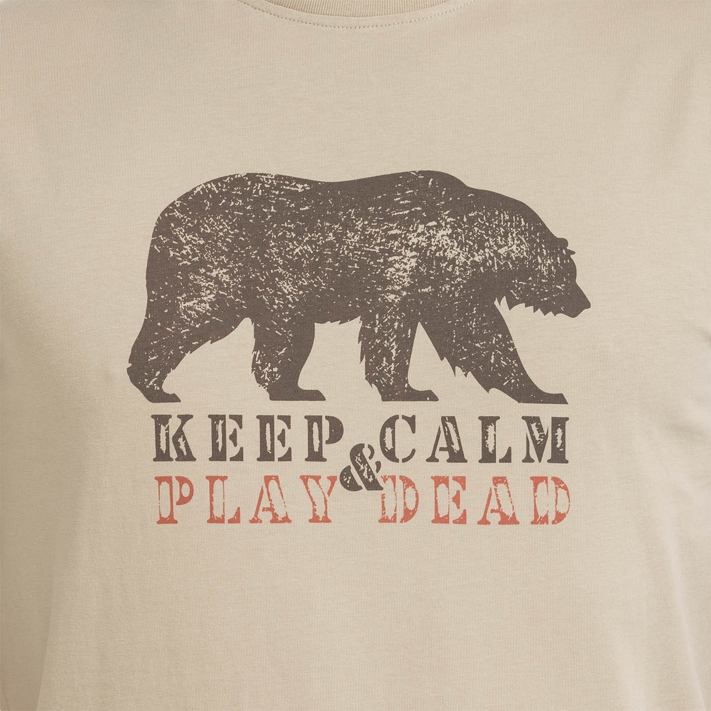 Když se situace vyhrotí, zachovej klid… a hraj mrtvého. Vtipný potisk – obrázek medvěda s nápisem „Keep calm and play dead“ – jasně vyjádří tvůj postoj. Tričko ze 100% bavlny, základního rovného střihu, ti zajistí pohodlí i v těch dnech, kdy chceš hlavně splynout… a hrát mrtvého. Změkčeno praním.