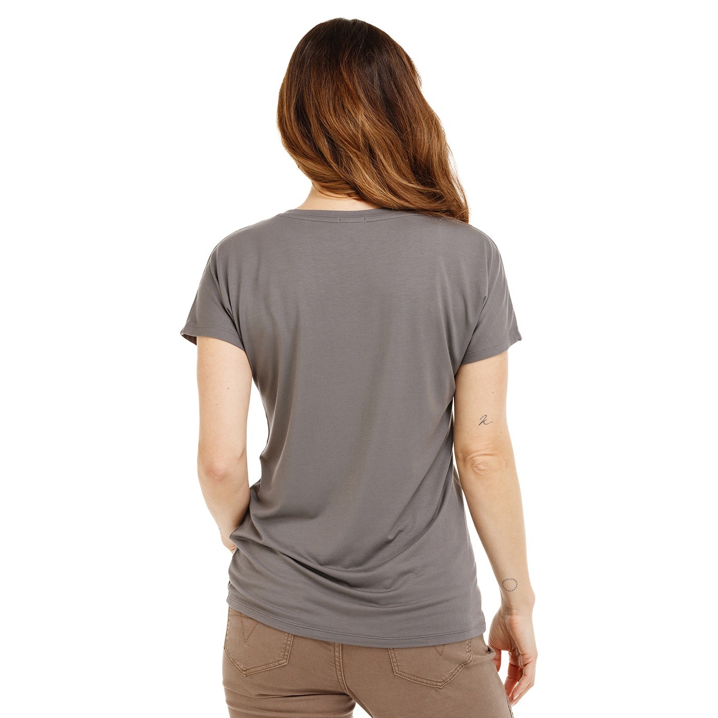 Tričko DIARA je vyrobené z modalu (TENCEL™), z vlákna, které je mimořádně měkké, hladké a příjemné na dotek. Díky příměsi elastanu je materiál lehce pružný, krásně splývá a na těle působí velmi lehce, téměř ho necítíš. Střih s výstřihem do V a krátkým spadlým rukávem zajišťuje pohodlí i volnost pohybu. Celek doplňuje decentní kovový label umístěný na spodním lemu.