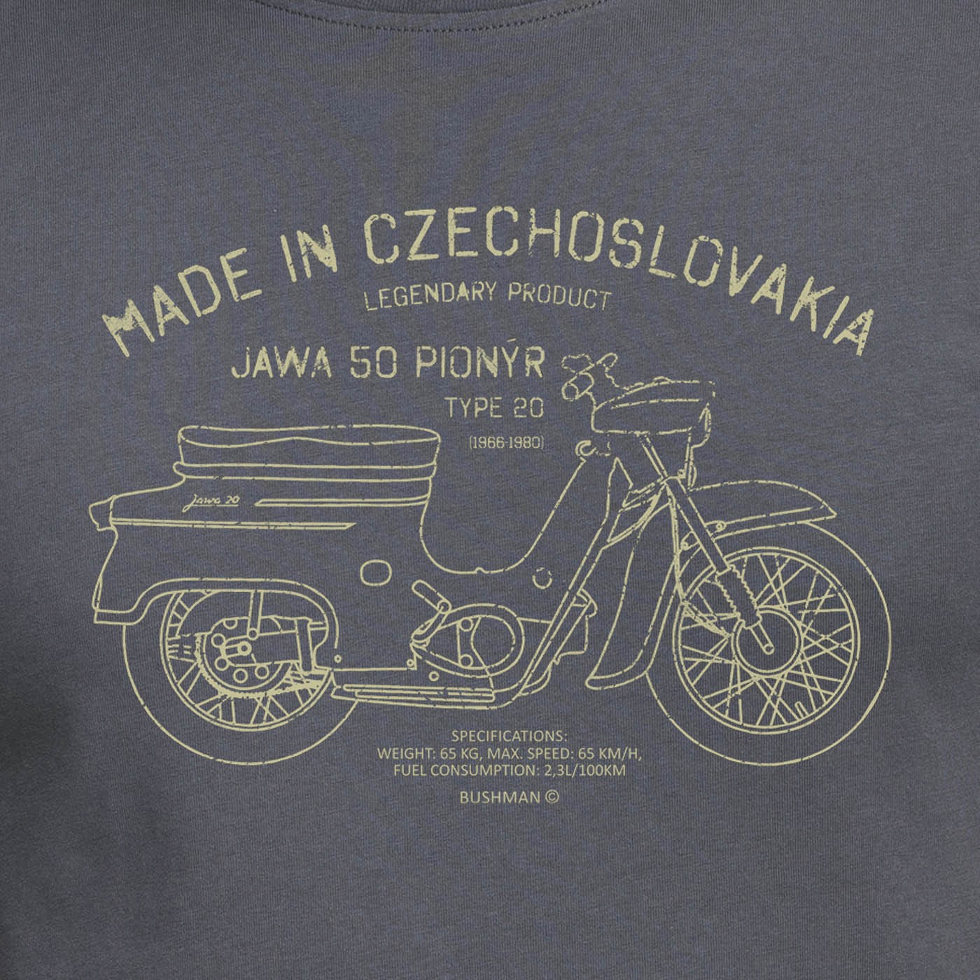 Legendární produkty nestárnou – jako Jawa 50 Pionýr. 100% bavlněné tričko s krátkým rukávem a potiskem ze speciální edice legend "made in Czechoslovakia".