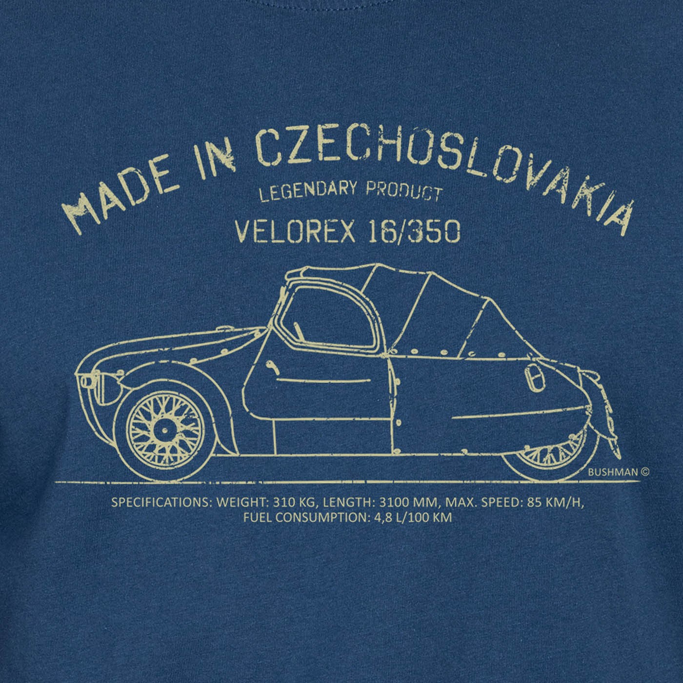 Vážíme si věcí, které dobyly svět nebo srdce minulých generací. Velorex, přezdívaný hadrák, hadraplán, husí stehno, montgomerák, netopýr, splašené trubky či prchající stan, se stal jediným homologovaným vozidlem s plátěnou karoserií na světě. Původně malosériový trubkový rám potažený koženkou konstruktérů Františka a Mojmíra Stránských se vyráběl ve velodružstvu Solnice jako vozítko pro invalidy a proslavil se ve filmu Vrchní prchni. Speciální edicí potisků na těchto bavlněných tričkách s krátkým rukávem vzdává BUSHMAN hold legendárním produktům "made in Czechoslovakia". 100% bavlna, 180 g/m2, rovný střih.
