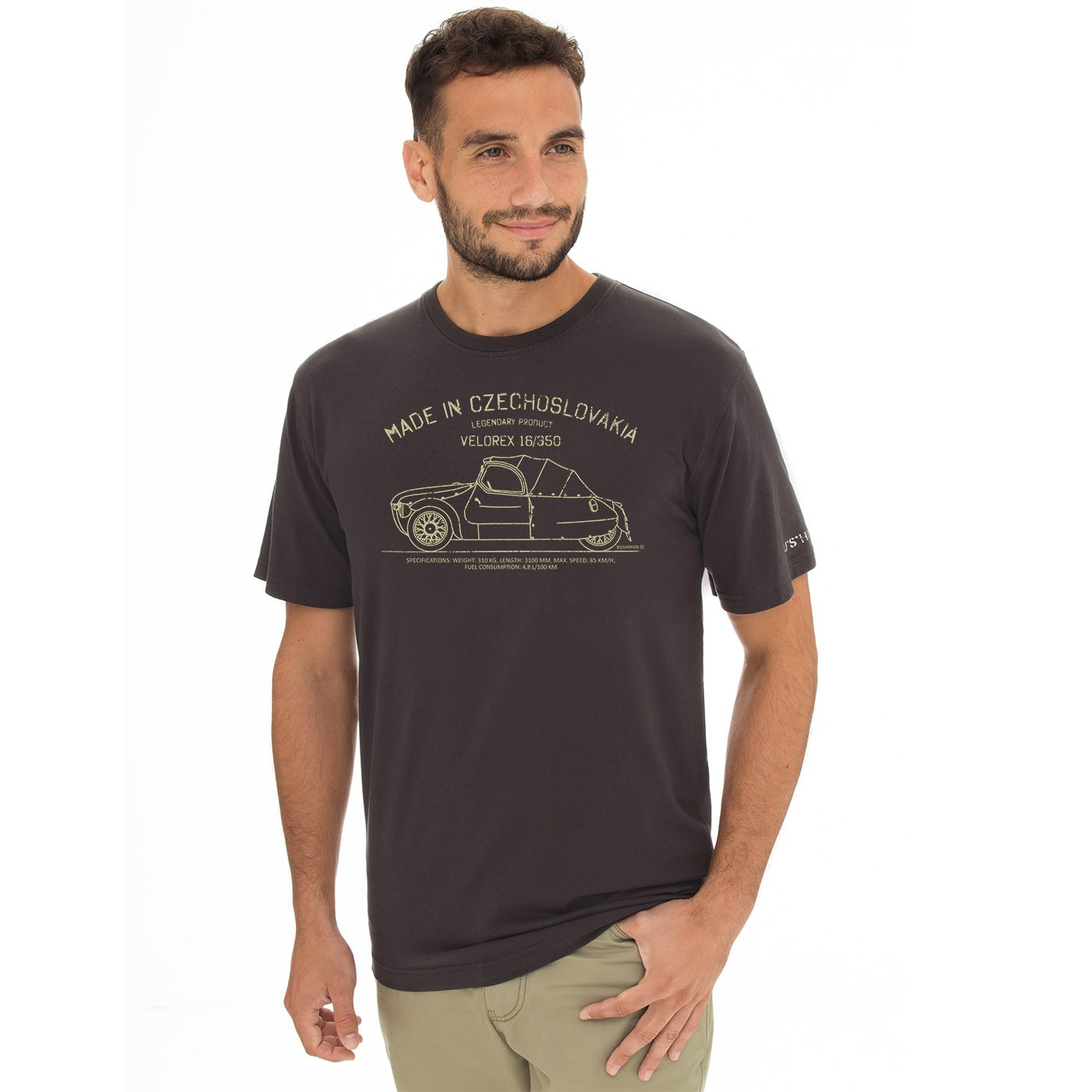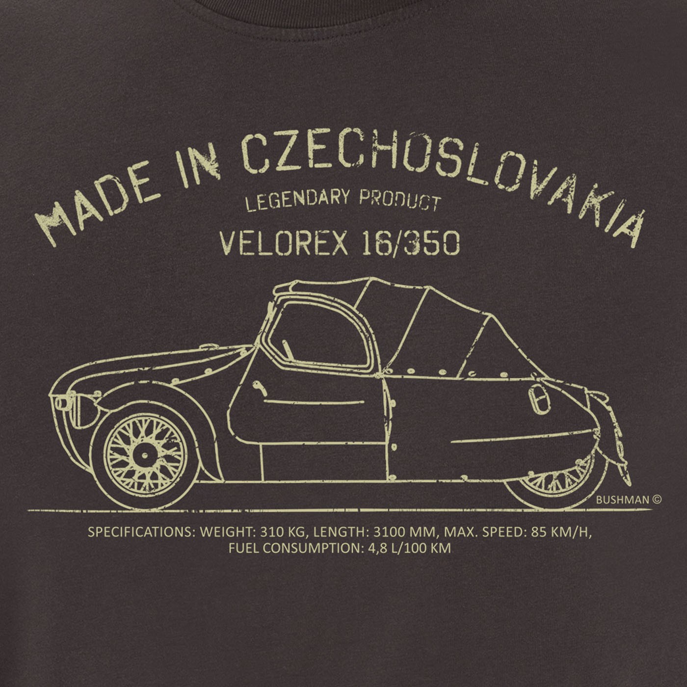 Vážíme si věcí, které dobyly svět nebo srdce minulých generací. Velorex, přezdívaný hadrák, hadraplán, husí stehno, montgomerák, netopýr, splašené trubky či prchající stan, se stal jediným homologovaným vozidlem s plátěnou karoserií na světě. Původně malosériový trubkový rám potažený koženkou konstruktérů Františka a Mojmíra Stránských se vyráběl ve velodružstvu Solnice jako vozítko pro invalidy a proslavil se ve filmu Vrchní prchni. Speciální edicí potisků na těchto bavlněných tričkách s krátkým rukávem vzdává BUSHMAN hold legendárním produktům "made in Czechoslovakia". 100% bavlna, 180 g/m2, rovný střih.