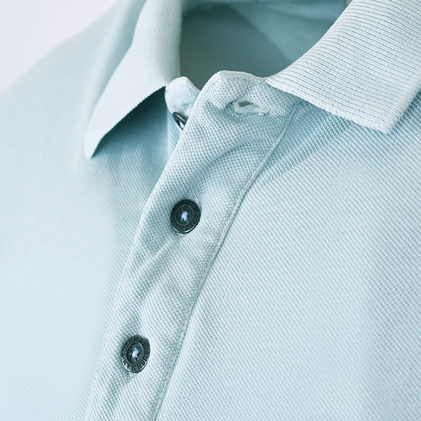Tričko Spencer má límeček, zapínání na tři kovové knoflíky a boční rozparky, které jsou dekorativně ozdobené tkanicí. Použitý materiál je PIQUÉ — pletenina s reliéfovou strukturou, která zaručuje tričku stálý tvar i vzhled.